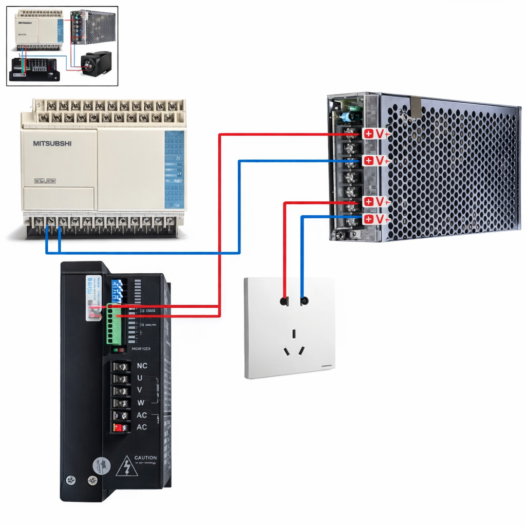Sumber daya yang sama memberikan tegangan ke PLC dan memberi referensi sinyal untuk driver.