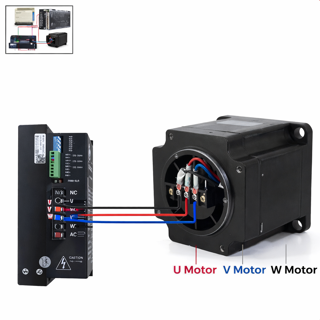 kabel motor stepper 3-phase masuk ke terminal U / V / W driver.