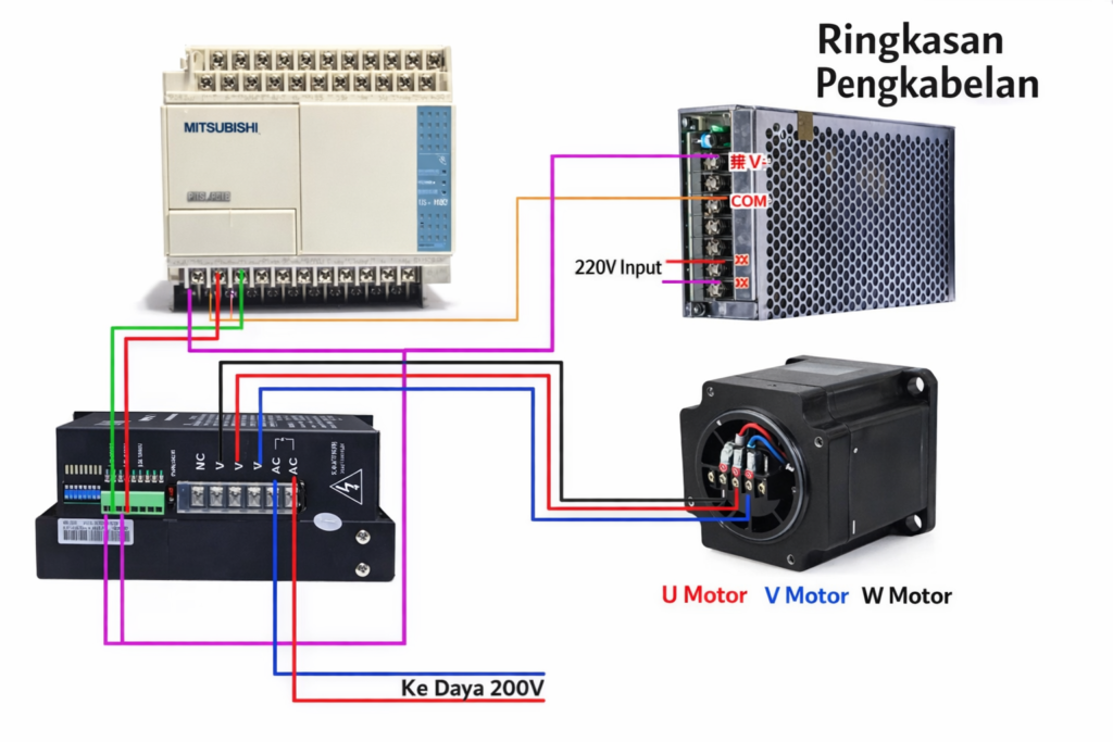 Inti gambar:PLC memberikan sinyal kontrol (pulse, arah, enable) langsung ke terminal sinyal driver.