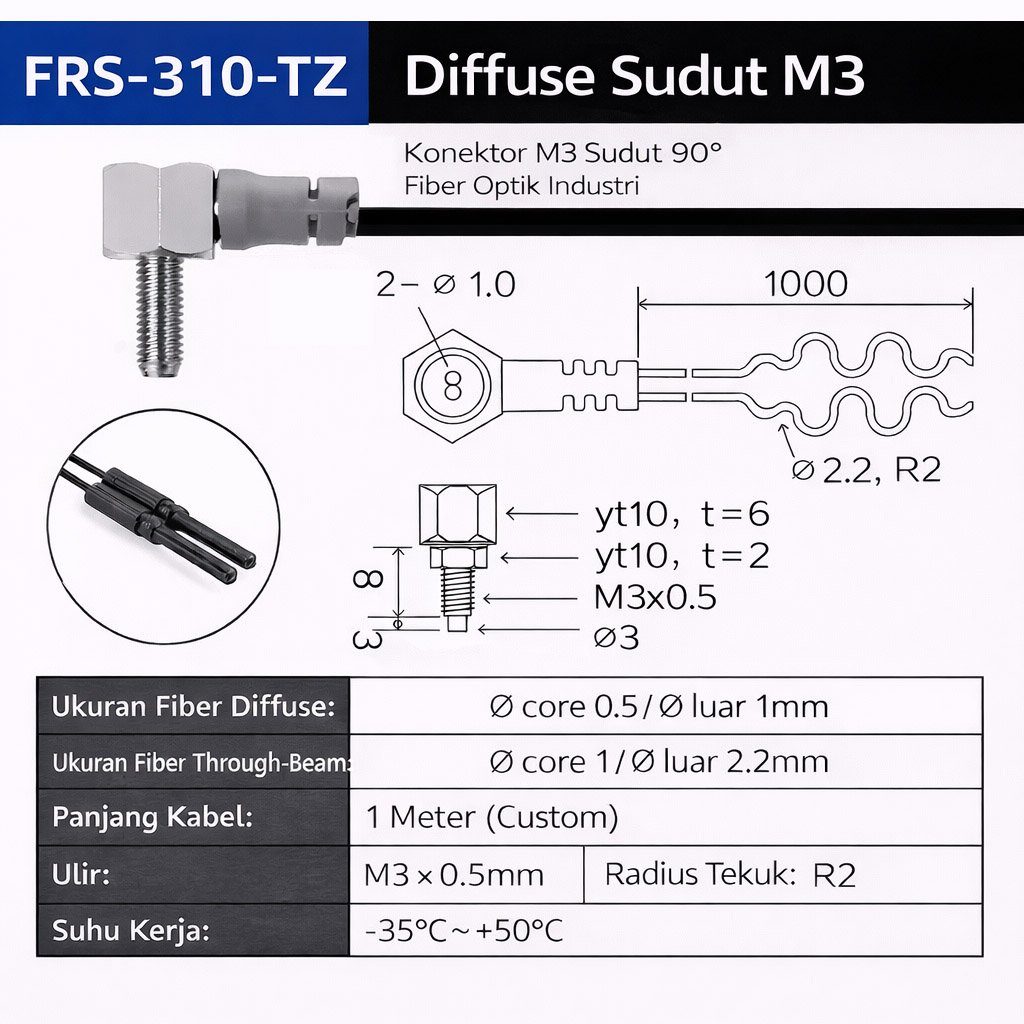Fiber optic sensor tipe diffuse (reflektif), konektor M3 sudut 90° (elbow), tidak memerlukan reflektor tambahan, desain kompak untuk ruang sempit, transmisi cahaya stabil, cocok untuk objek kecil dan aplikasi presisi, struktur logam kokoh, kompatibel dengan fiber amplifier industri