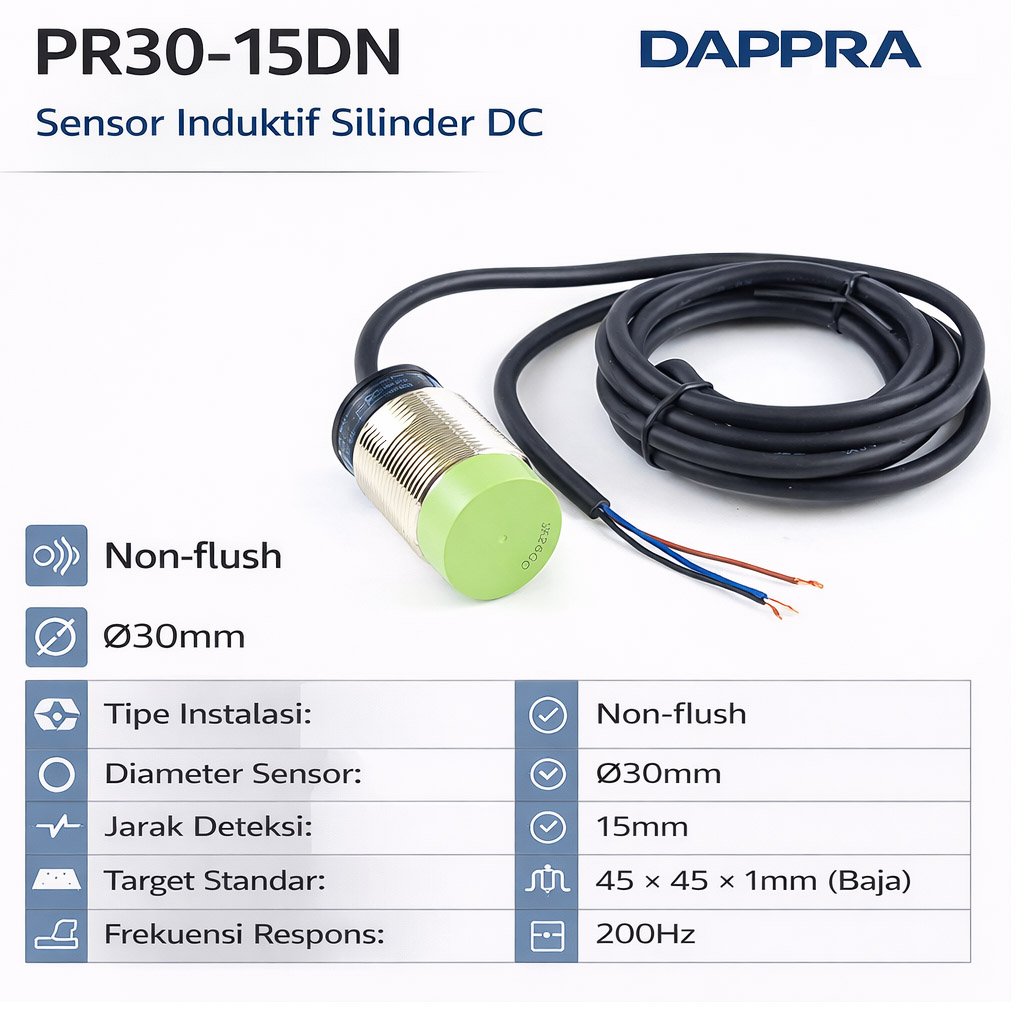 M30 round inductive proximity sensor, 15mm sensing distance, NPN normally open output, DC 3-wire 10-30VDC operation, non-shielded installation type, built-in surge and overcurrent protection, reverse polarity protection, IP67 rated housing, red LED operation indicator